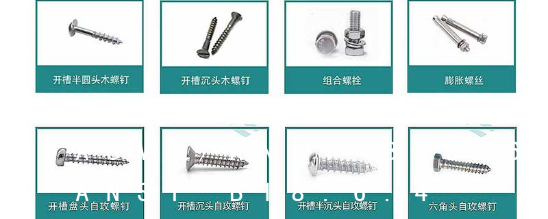 (鐵板牙自攻螺絲) B-2: Plastic Tapping Screw. (塑膠用,自攻螺絲) C: Wooden Screw : 木工螺絲 D: Drywall Screw :水泥墻螺絲 E: Self Drilling Screws鉆尾螺絲(不銹鋼鉆尾螺絲,復合材料鉆尾螺絲) F:膨脹螺絲,四片膨脹螺絲又名:四片壁虎。 膨脹螺栓的等級分為:45、50、60、70、80, 膨脹螺絲的材料:主